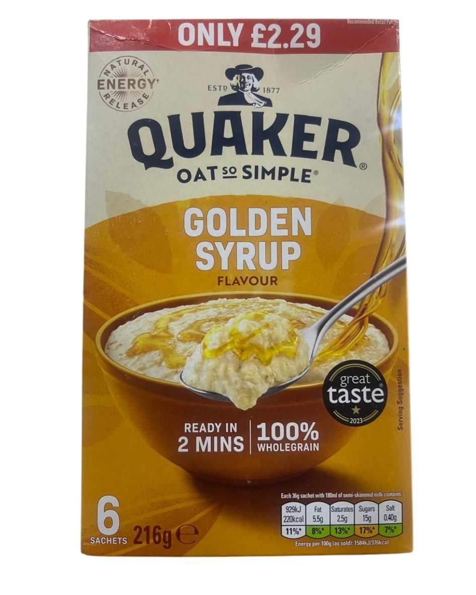 Quaker Oat So Simple Golden Syrup 216g combines creamy oats with a sweet syrup flavor for quick breakfast preparation.